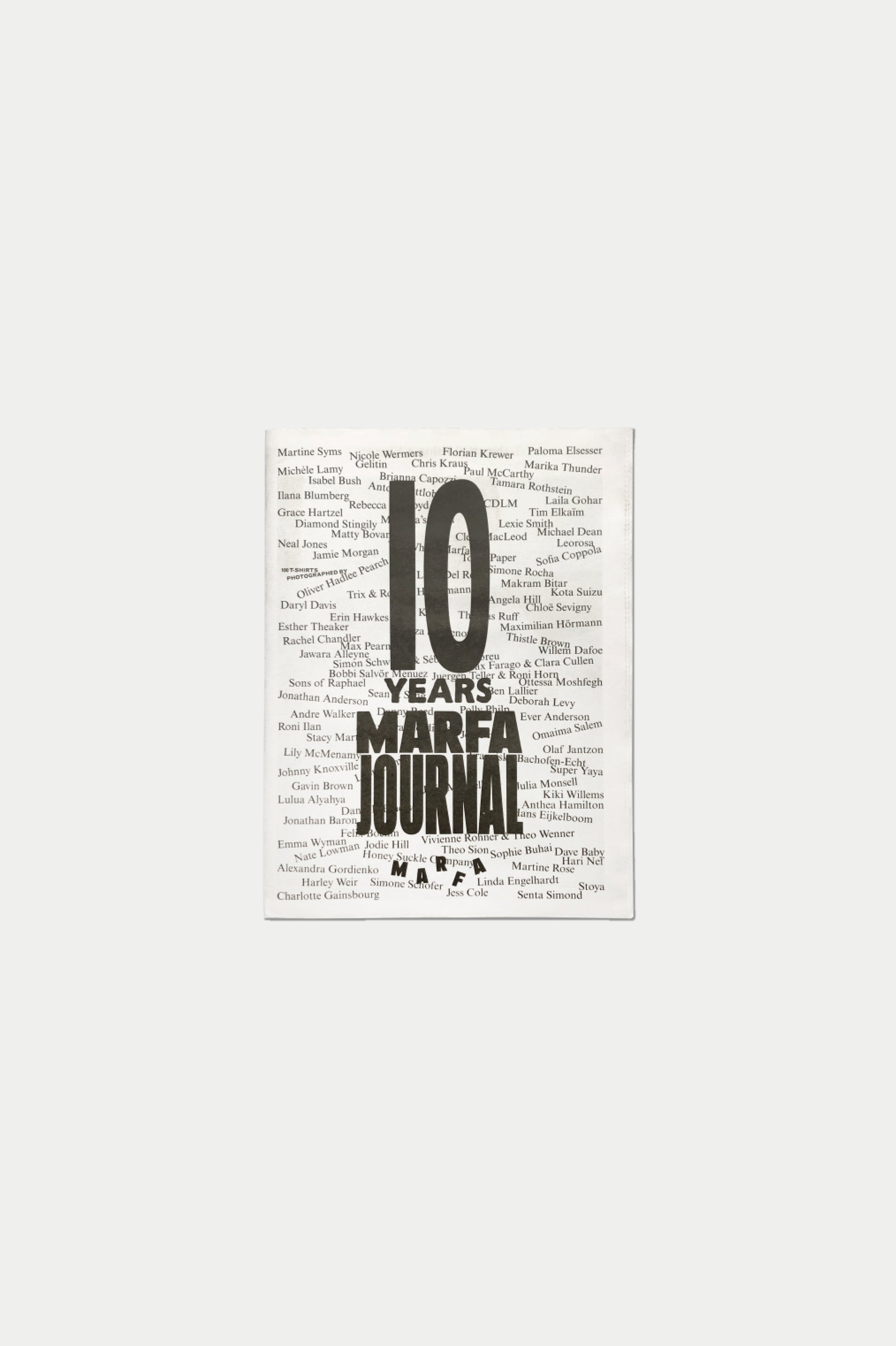 過去10年間を象徴するアイコニックな人物や瞬間によって制作された 100枚のTシャツ を収録した展覧会カタログ(ブロードシート新聞形式 )。ニューヨーク、パリ、ロンドンにて オリヴァー・ハドリー・パーチ が全編撮影し、モデルや MARFAMILY、MARFRIENDS が、展覧会で発表されたTシャツをそれぞれ着用した姿を収めています。
